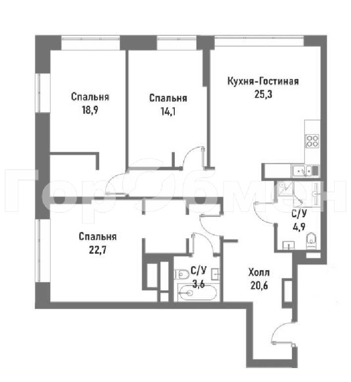 Комнаты: 25.3 18.9 14.1 22.7 м2